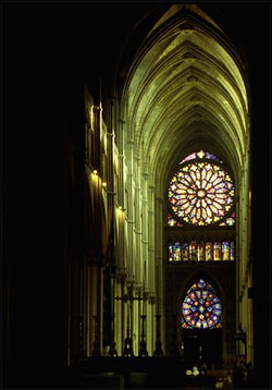 Sometimes, in the late afternoon, when the day has been dark under a heavy cloud blanket, the cloud clears cleanly from the west, and the warm-toned evening sun shines in almost horizontally to illuminate the world like a searchlight. Where it shines the light is only sunlight, for the cloud blanket prevents any sky light, so everything is lit in bright high contrast, against an almost-black sky. This is lighting so startling that one needs to be deeply identified to miss it. Any photographer regrets meeting this light without a camera, but I was fortunate on that day years ago when passing the white gate of that farm near Harefield, on the western outskirts of London. So often it is the quality of light that makes a photograph special. sometimes the light illuminating the subject, but more often the light shining through it. Light in the physical world, visual light, seems to call us to mind of a more subtle light. LIGHT AND THE MIND Expression such as "I saw the light", and "enlightened" make a clear connection between the experience of light and the experience of understanding, so a psychological significance to light is admissible even in these secular days, recognisable as an archetypal quality of the nature of mind. In the past however, in less secular times, light was viewed as a symbol of the divine, and this in the most ancient of records. The divine light was seen as illuminating the individual, and then lifting the individual soul itself to radiance, the light shining on it and through it. INSPIRATION AND THE ANGEL Light is the messenger of the Universe, telling us almost all we know of galaxies millions of light years away, a little perhaps, like the angels of traditional mythology. Angels are becoming fashionable again, after a long period of neglect. Most of us experience occasional clear moments of creativity or comprehension which seem to arrive out of the blue. We know that the solution has arrived through the vehicle of our own mind, but the process is so deeply hidden that it seems like a gift, inspiration, mysteriously delivered from "above", enabling us to create, or to act, for ourselves. There is today again a half-willingness to personalise this delivery, and to put it into the hands of an angel. Such an angel need have no hope of an external existence, for it is an aspect of mind, the bringer into everyday linear consciousness of the huge parallel processing resources of the brain, a metaphor for brain activity beyond our understanding. In all of this there is only the slightest shift of effect from the action of the angels found in the mythology of most cultures. The angel is a useful metaphor for the action of inspiration or understanding, and need not be a surprising construct, since the mind seems made to use images for internal and external communication. The angel brings us the light that enables us to shine, psychologically and spiritually. LIGHT AND THE CATHEDRAL During the Middle Ages, when the cathedrals were being built, light symbolism, light metaphysics, was an influential idea. Abbot Suger, whose inspiration can be said to have invoked the change from Romanesque to Gothic architecture, specifically recorded his own peak experiences evoked by light, and set down him aim to use light in his church to lift people from their everyday concerns to a spiritual consciousness. This idea was enthusiastically adopted at Chartres, where almost all of the stained glass remains, making a dark and mysterious interior enveloped in radiant, coloured light. The most enduring impression of Chartres Cathedral lies in the quality of its light, the three rose windows of its nave and choir crowned by the arc of light in the choir clerestory. Here, the truth that the light is shining through the glass, rather than from it, is obvious. LIGHT AND CONSCIOUSNESS Light arouses excitement at simple levels, a floodlit building, an illuminated fountain, a firework display, or the great illuminated signs of places like New York or Piccadilly Circus in London, but also in more subtle ways in the shine of jewels, or the beams of stained glass in the cathedrals. All of these wake us up into sharpened perception. Light calls us to a more alert consciousness, and becomes itself a metaphor for consciousness. We see the sign of consciousness in the face of the green man in traditional sculpture (and now again in modern sculpture), and now we see the sign of consciousness also in light itself, perhaps the first physical phenomenon after energy. First energy, then light, then consciousness. Light by chance will awaken us, but we need to make it less accidental, and learn to wake up for ourselves. |